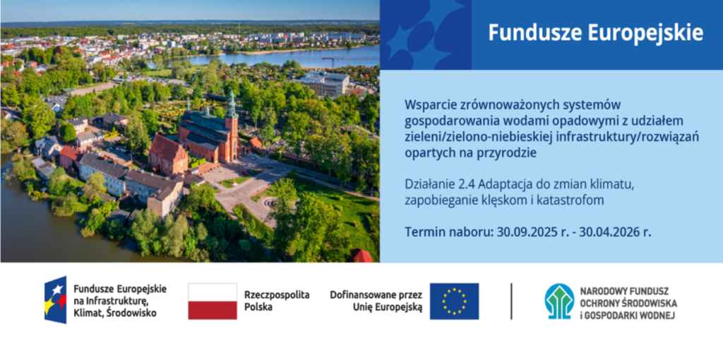 Finansowanie w ramach działania 2.4 Adaptacja do zmian klimatu, zapobieganie klęskom i katastrofom, Typ projektu: Wsparcie zrównoważonych systemów gospodarowania wodami opadowymi z udziałem zieleni/zielono-niebieskiej infrastruktury/rozwiązań opartych na przyrodzie.