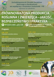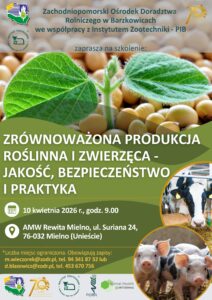 Zachodniopomorski Ośrodek Doradztwa Rolniczego w Barzkowicach, we współpracy z Instytutem Zootechniki – PIB, zaprasza na szkolenie pt. „Zrównoważona produkcja roślinna i zwierzęca – jakość, bezpieczeństwo i praktyka”, które odbędzie się 10 kwietnia 2026 r. o godz. 9:00 w AMW Rewita Mielno (ul. Suriana 24, 76-032 Mielno – Unieście).