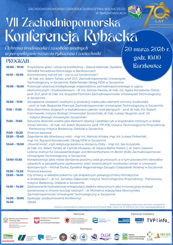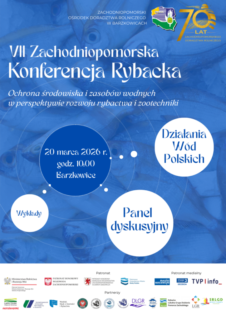 Zachodniopomorski Ośrodek Doradztwa Rolniczego w Barzkowicach zaprasza do udziału w VII Konferencji Rybackiej, która odbędzie się 20 marca 2026 r. o godz. 10:00 w Barzkowicach.