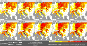 w warstwie do 40 cm występuje na terenie całego kraju, natomiast względne nasycenie gleby wodą utrzymuje się tylko w najpłytszej warstwie do 10 cm. Intensywność suszy w wierzchniej warstwie gleby jest wysoka, a miejscami bardzo wysoka. W odniesieniu do warstwy głębszej, czyli powyżej 40 cm w niektórych rejonach kraju występuje miejscowo ekstremalna intensywność objawów suszy.
